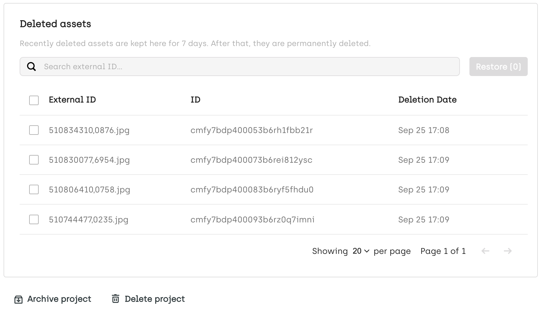 - Restore deleted assets (within 7 days): Project admins can now restore deleted assets for up to 7 days after deletion. From the Admin menu, simply select the assets you want to recover—they’ll be returned to the queue along with any associated labels.